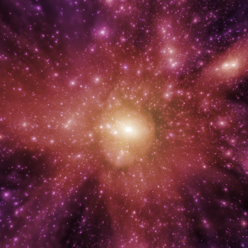 Did you know that most of the material in the Universe is made of dark matter? Dark matter is the name that we give to matter or "material" that we cannot see and appears to be made up of something other than the regular materials we know about. Astronomers know that this extra dark matter must be present because of the strong effect that its gravity has on light and other objects nearby. This picture shows what the dark matter may look like surrounding a galaxy viewed from a very large distance if you had a special "dark matter" telescope. This model image was made using a computer and the colours are not real; however, bright colours show you where lots of dark matter should be found. Most of the stars in a model galaxy would only found in the central bright region of this picture.