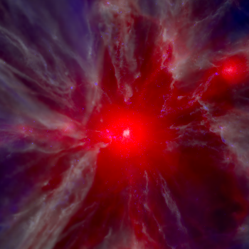 Gas and dust are an important part of galaxies because they are the materials that stars are made from. Spiral galaxies contain a large supply of gas and dust and therefore lots of new stars can be made. In the picture you can see gas around a galaxy, viewed from very far away. This picture was made with a computer and the colours are not real but tell you about the temperature of the gas (hot gas is shown in red). Gas falls onto the galaxy from large distances. This gas will go on to form more stars in the future unless something stops it from getting cold enough to clump together, such as exploding stars or the supermassive black hole.