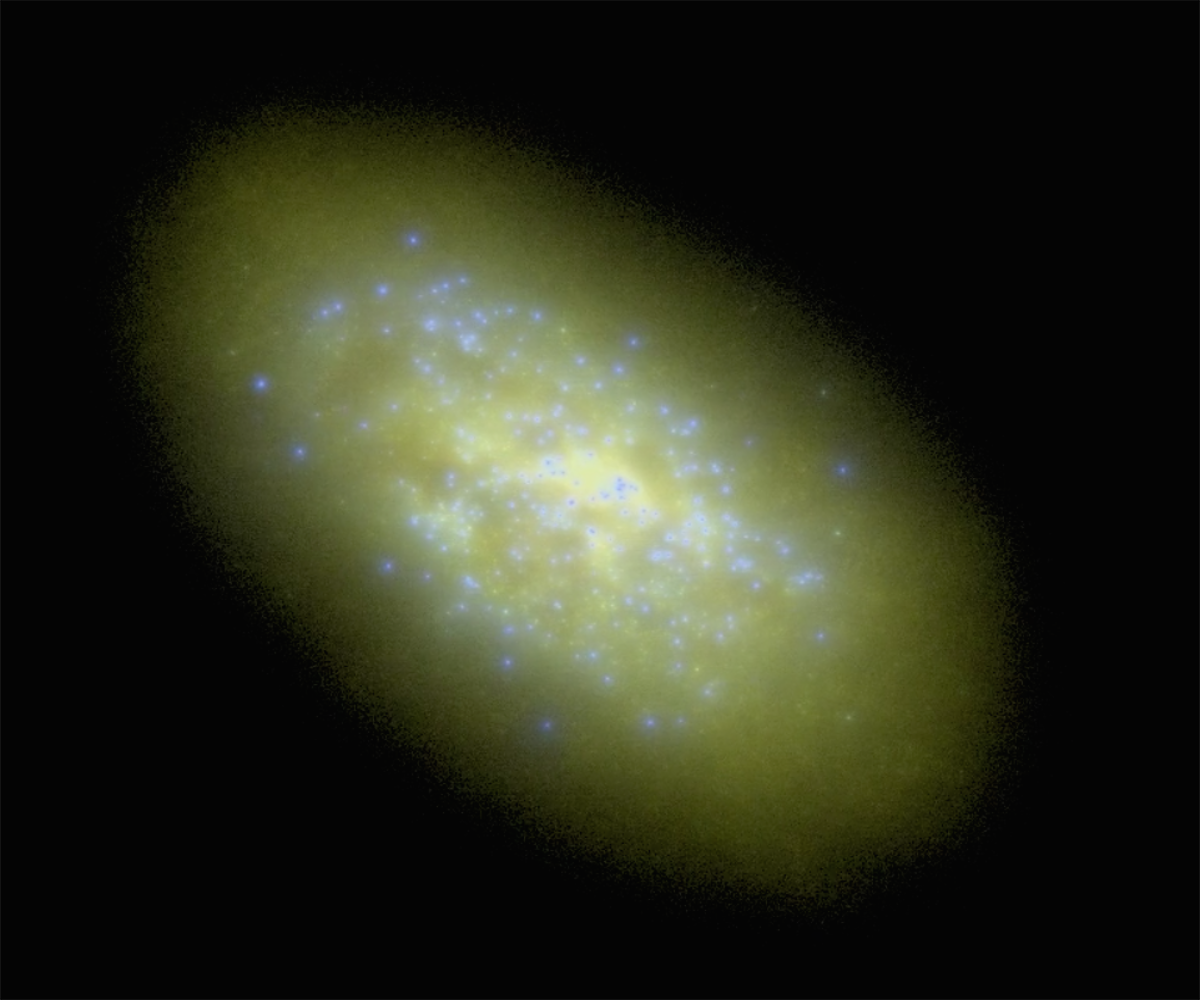 Stars are big balls of very hot gas that produce their own light. Big galaxies contain billions of stars of different sizes and colours. Old stars are usually redder than young stars because stars get colder as they start to run out of fuel. However, some of the heaviest stars end their lives in gigantic explosions called supernovae. Look at the image of your model galaxy and notice where most of the blue (young) stars are found.
